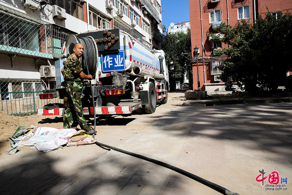 为确保王大爷家下水道彻底畅通,张喜忠在当日下午把清污水车开到了小区,用高压水枪对小区地下管道进行了彻底清理。中国网记者 董宁 摄影