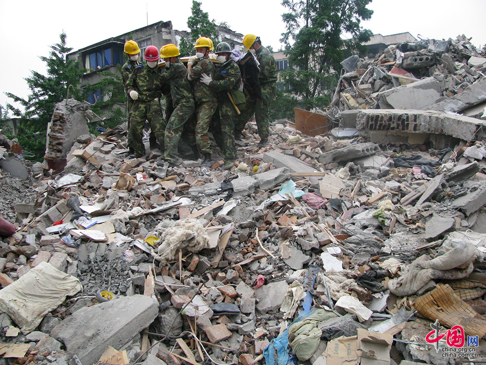 2008年汶川大地震,张喜忠带领“老兵”第一时间赶赴灾区,一次次钻进废墟危楼,用镐刨,用锹挖,甚至用手扒,凭着军人的坚贞不屈和忠诚顽强与解放军官兵一起,在余震中抢救出了6名群众。(受访对象供图)