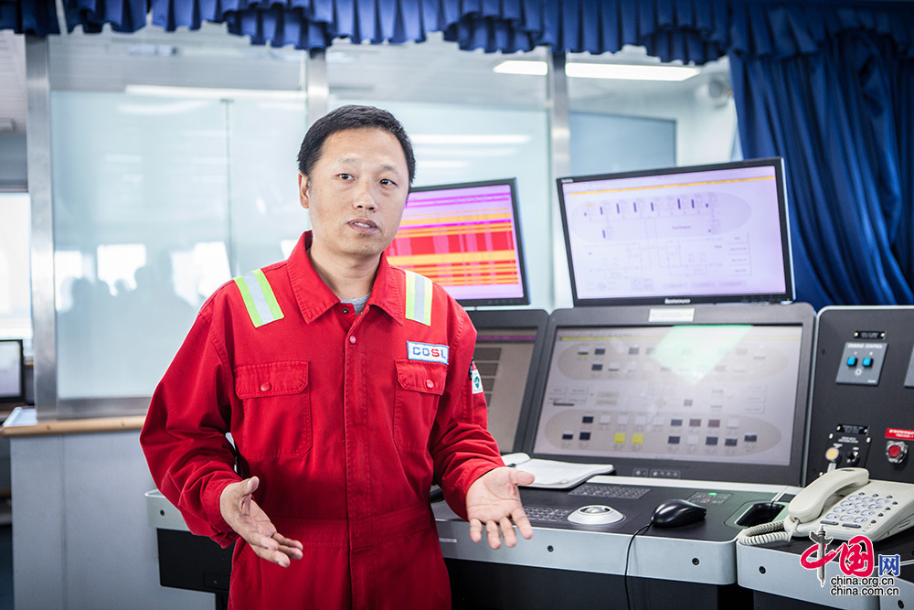 在我国自行设计建造并拥有自主知识产权的首座深水半潜式钻井平台建成后,盖凤喜放弃国外平台薪酬优越的工作,毅然选择加入国内首座深水动力定位平台的作业团队,参与运营前调试,海试等,以及最后在海上的实际运营。他带领团队完成动力定位作业所必须的操作手册及程序,为安全作业提供保障。到目前为止该平台保持良好的定位安全记录,优于国外同类型定位系统的平台在该区域的作业水平。中国网记者 伦晓璇 摄