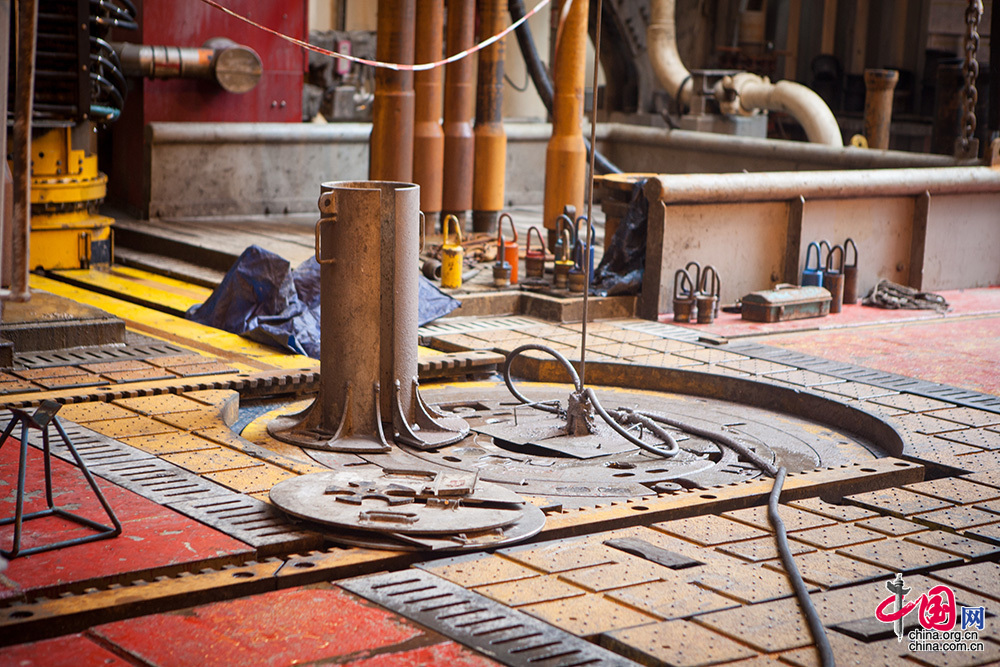 常规的半潜式钻井平台由锚链定位,当其到达井口位置时,通过向周围不同方向抛出锚链固定在海底来保持相对稳定。然而,当作业水深不断加深特别是1000米水深以上时,要保持平台的安全稳定,用常规的锚链固定就显得“鞭长莫及”,也不符合经济效益。因此深水钻井,“定海”必须靠动力定位系统。中国网记者 伦晓璇 摄