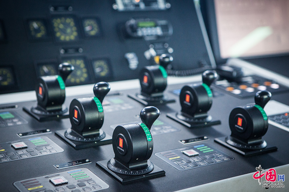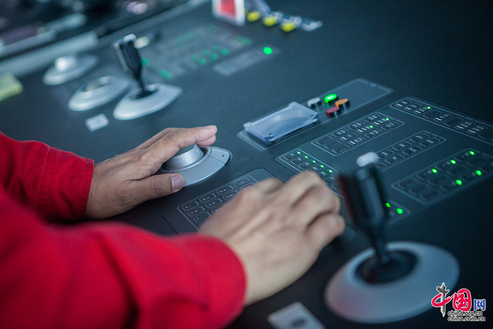 六个推进器操作手柄,可以远程控制六个螺旋桨,动力定位系统会调整推进器的推力和方向,保障平台定位在指定位置。中国网记者 伦晓璇 摄