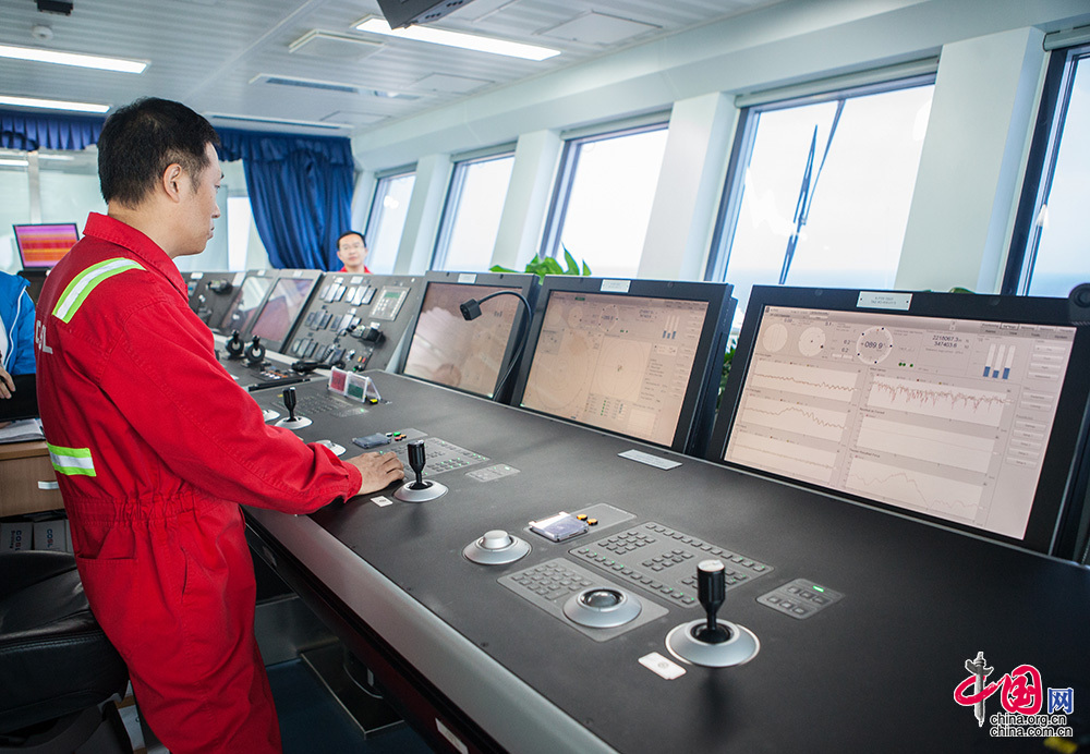 “兴旺号”有很多精准的传感器,能实时感知水流、风速、风向、平台纵摇横摇上下升沉的变化,它还拥有精确的卫星及声纳位置参考系统动力定位系统,通过分析传感器及系统提供的数据对推进器的推力和方向进行调整,确保平台定位在指定位置。中国网记者 伦晓璇 摄