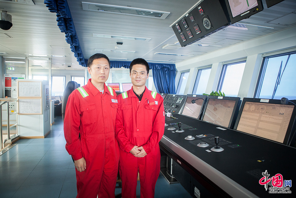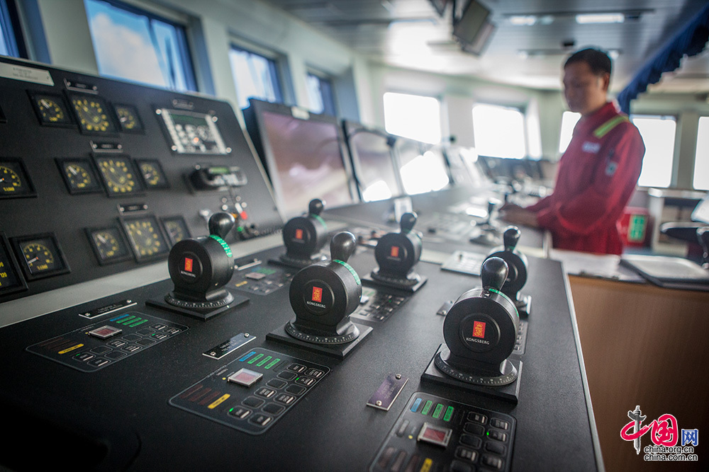 ??? 越是高精尖的设备对操作者的技术要求就越高。作为高级定位师,他们负责掌控动力定位系统,确保船舶“纹丝不动”。此外,在平台航行、移位过程中,定位师还负责制定具体航线。他们不仅需要密切关注设备的运行,还需注意气象和海况的变化,其中台风就是作业的最大风险之一,因为平台移动速度慢,有时还悬挂隔水管,不可能驶离太远,定位师的操作直接关系到整个平台船体结构的安全及人员安全。中国网记者 伦晓璇 摄