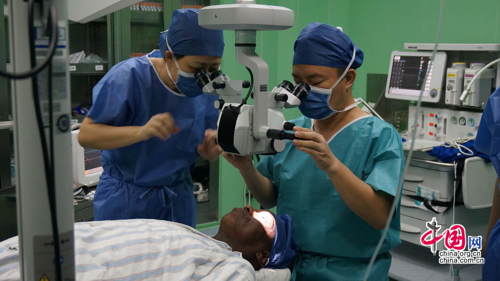 8月26日,在和平方舟手术室,眼科主治医师吴晋晖(右)与队友杜改萍为吉布提当地患者实施白内障手术。面对非洲眼病患者需求量极大状况,吴晋晖和他的同事采取白天诊疗、晚上手术的方法,每天工作十几个小时,尽可能为更多患者排忧解难。江山摄