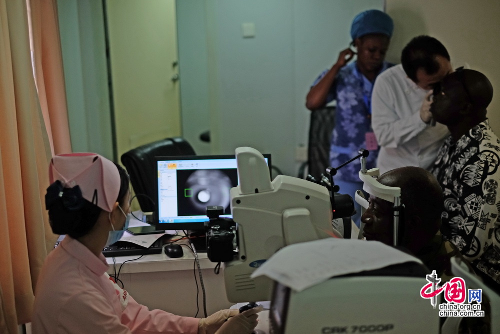 9月21日,在中国海军和平方舟医院船上,眼科门诊为塞拉利昂民众进行眼睛检查。(右一医生为吴晋晖)当地年龄87岁的老人阿尔吉斯(ALHGIS)是弗里敦50公里外的村民,双眼几乎失明,由儿子陪同来做白内障手术,术后视力恢复到1.0。当看清吴晋晖这个主治医生时,老人激动的举起大拇指,表达感激……当一个个白内障术后患者揭开纱布时,惊喜地说“VERY CLEAR(非常清楚)”,而此时此刻,吴晋晖和他的同事会感到无比幸福。江山摄