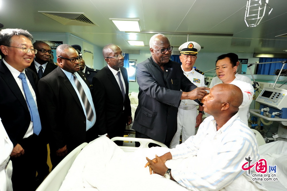 10月7日,在中国海军和平方舟医院船,加蓬总统邦戈看望慰问术后留船住院的白内障患者。刘洋摄
