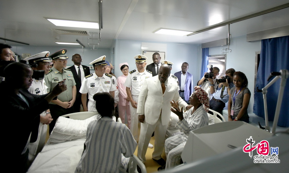 10月11日,在中国海军和平方舟医院船,刚果(布)总理穆安巴登船参观,盛赞医院船为刚果(布)民众提供的免费诊疗服务,称和平方舟不仅名字里强调“和平”两字,更以实际行动向世界传递大爱与和平。江山摄