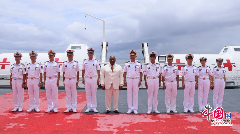 10月6日,加蓬国防部举行了隆重授勋仪式,向在加中交流合作中做出杰出贡献的11名任务官兵授予荣誉勋章。我非常荣幸获得了加蓬国家医疗服务银质勋章,还受到了加蓬总统邦戈的亲切接见。加蓬总统邦戈以加蓬人民的名义高度评价医院船为加蓬民众提供的免费诊疗服务!刘洋摄