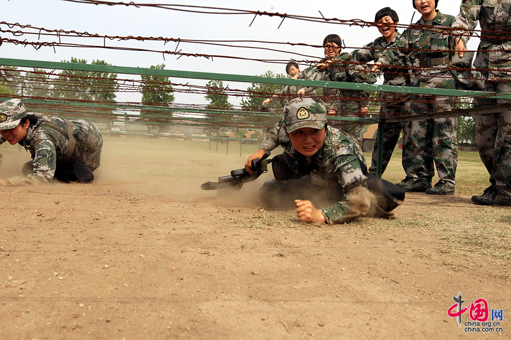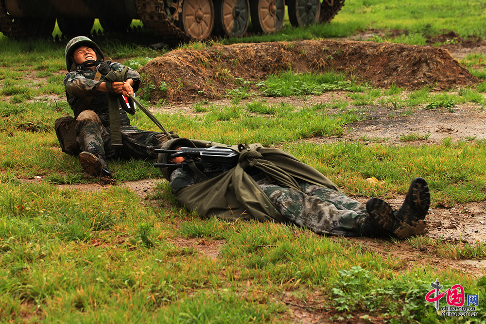 2016年7月15日,雨后地面潮湿,增加了训练的难度。杨叶进行战场救护训练,她艰难地搬运男伤员。