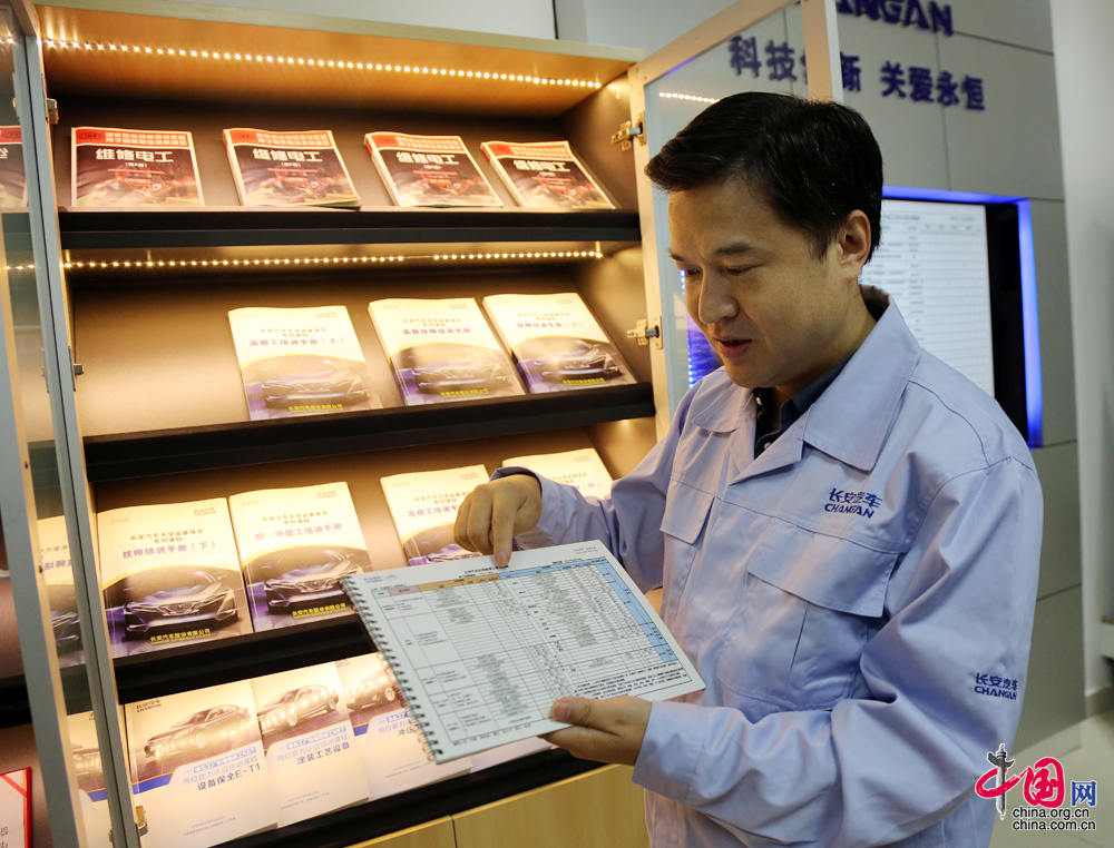 刘源发起了将厂里先进维修案例、技术、经验“留下来”的工作。先后编制了《长安汽车大学设备保全系列课程——高级工培训手册》(上中下册),里面收集了长安集团建厂以来的很多维修案例,是一个关于设备维修的百科全书。 中国网 杨楠 摄影报道