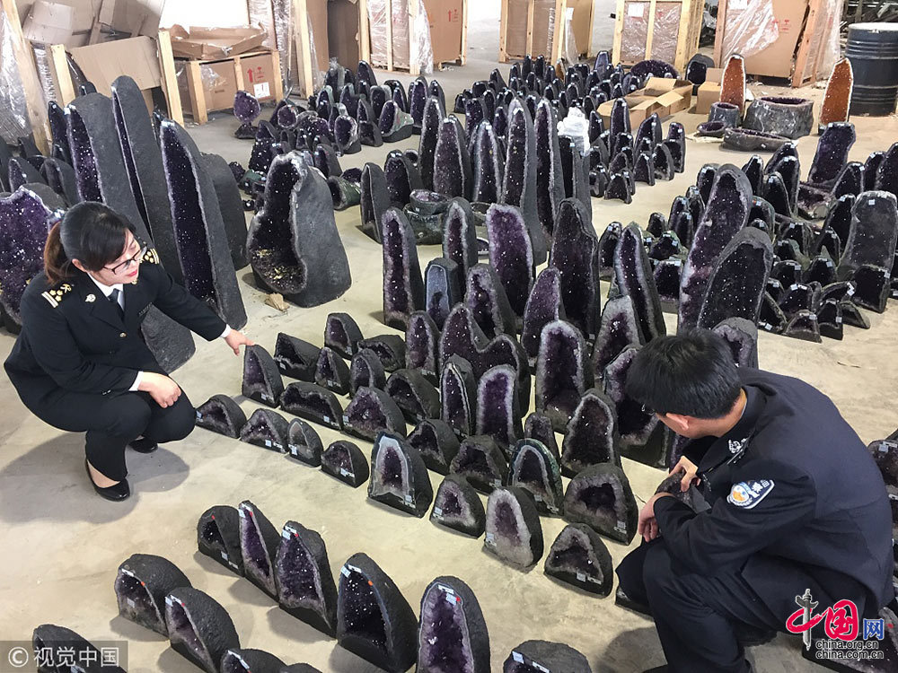 2017年11月20日消息,将高税率水晶制成品伪报成低税率水晶原石,高价低报,或少报数量。近日在南京海关了解到,该关连续破获26起水晶走私案,摧毁4个盘踞在连云港口岸的水晶走私团伙,涉案案值高达2.67亿元。蔡岩红 摄 图片来源:视觉中国