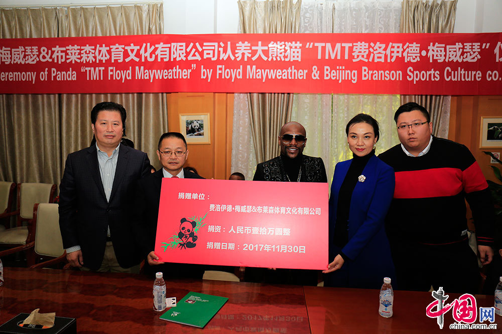 中国网讯 2017年11月30日下午2点30分,世界拳王梅威瑟认养大熊猫仪式在在成都大熊猫繁育研究基地隆重举行,拳王梅威瑟与布莱森体育文化有限公司捐赠10万元认养成都大熊猫繁育研究基地2016年7月26日出生的一只大熊猫,并为大熊猫取名为“TMT费洛依德 梅威瑟”。