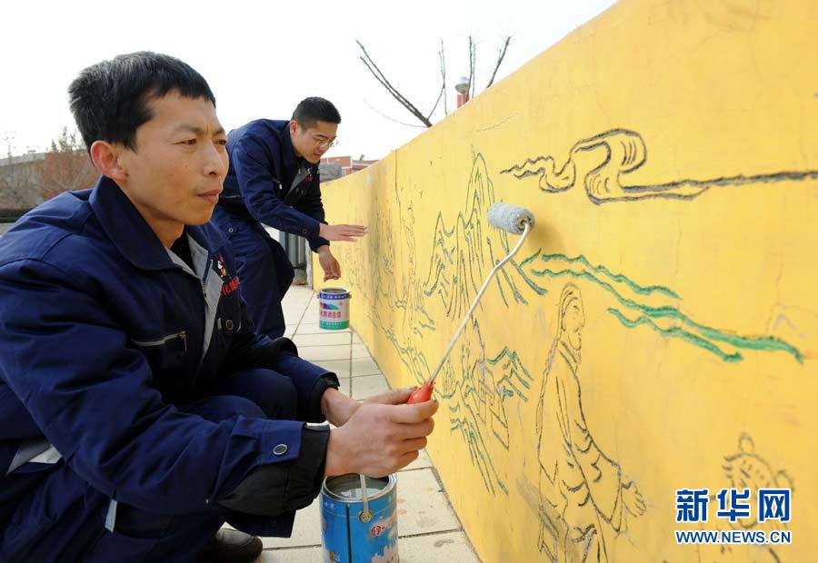 12月4日,位于山东省昌乐县红河镇的山东乐化集团的员工,用自己生产的油漆在村里的文化墙上绘制我国传统文化的图案,促进新农村文化建设。该企业建厂30年来,从 12 个人干起,发展成为如今年收入18 个亿的具有完全自主知识产权的大型企业,其产品在国内市场占据了主导地位。新华社发(刘玉和摄)