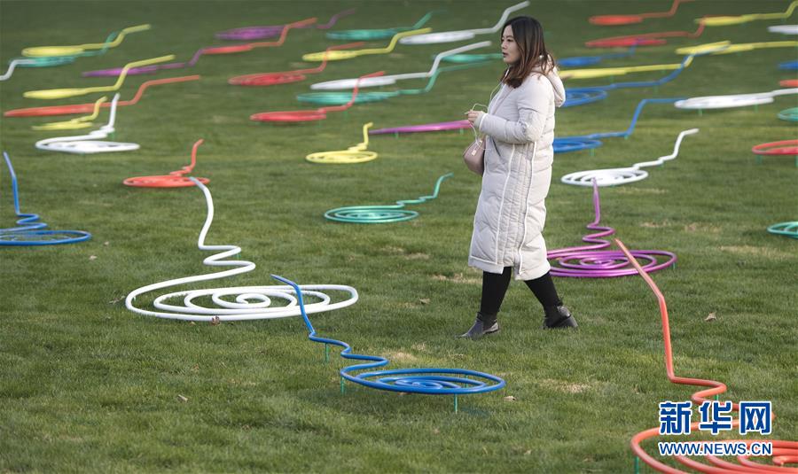 12月17日,参观者在欣赏展出的装置作品《迁徙》。当日,“27度角——东湖国际生态雕塑双年展”在武汉市石门峰纪念公园开展,现场展出来自全球22个国家和地区的92位雕塑艺术家的作品。此次展览将持续至2018年4月17日。新华社记者喻珮 摄