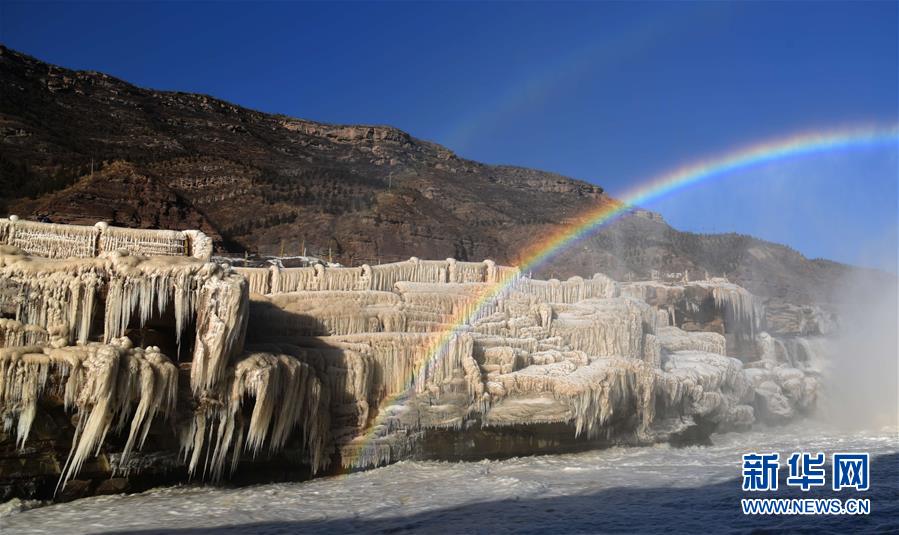 这是12月17日在山西吉县黄河壶口瀑布拍摄的冰瀑彩虹景观。当日,黄河壶口瀑布出现彩虹景观。壶口瀑布两岸姿态万千的冰瀑,与瀑布上空的彩虹相映成趣,美不胜收。新华社发(吕桂明摄)