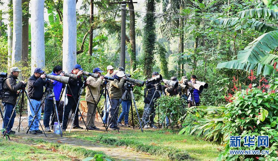 12月17日,在福州国家森林公园,众多摄影爱好者在拍摄红苞花丛中飞翔、采蜜的太阳鸟。入冬以来,福州国家森林公园多处红苞花竞相绽放,吸引了大批叉尾太阳鸟前来采蜜。叉尾太阳鸟娇艳靓丽,红苞花火红欲滴,花与鸟相映成趣,成为冬季榕城一道美丽的风景。叉尾太阳鸟是福州特有的“明星鸟”,又叫“亚洲蜂鸟”。仲冬时节,叉尾太阳鸟悬停吸食红苞花花蜜时的精彩瞬间,是鸟类摄影爱好者眼中最美的“花鸟图”。新华社记者梅永存 摄