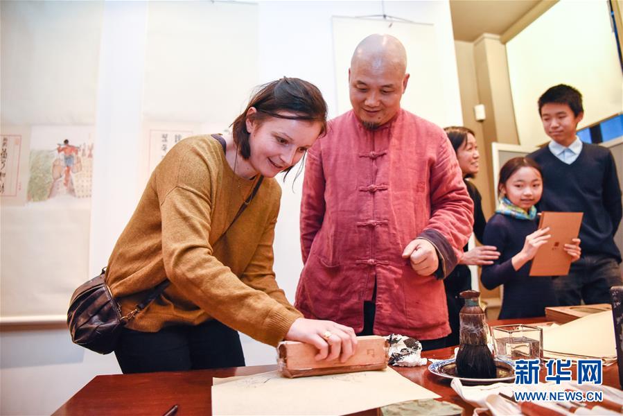 12月17日,在法国巴黎切努斯基博物馆,参观者在杭州十竹斋艺术馆馆长、十竹斋木版水印国家级非遗传承人魏立中(左二)的指导下体验“木板水印”非遗技艺。当日,杭州十竹斋艺术馆馆长、十竹斋木板水印国家级非遗传承人魏立中携其作品“四美图”、“二十四节气”等来到法国巴黎切努斯基博物馆,向参观者介绍并演示“木板水印”非遗技艺。木版水印专业学名为“古代彩色版画印刷术”,集绘画、雕刻、印刷于一体,是对中国书画精品进行高仿真复制的传统工艺。新华社记者陈益宸摄