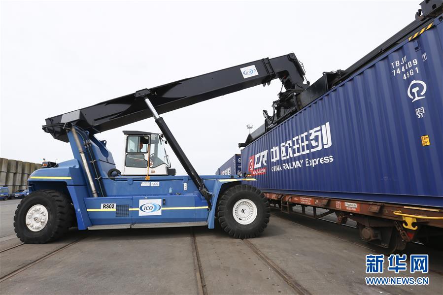 这是2017年6月30日,在比利时泽布鲁日港,工作人员将中欧班列沃尔沃汽车专列的一个集装箱卸货。从中国大庆出发经过20多天运行,运载着123辆沃尔沃S90汽车的中欧铁路首趟汽车专列6月30日顺利抵达比利时泽布鲁日港,标志着“中国智造”的豪华汽车首次以铁路专列形式销往欧洲市场,同时也标志着中比两国在“一带一路”建设框架下的合作迈出了新步伐。新华社记者叶平凡摄