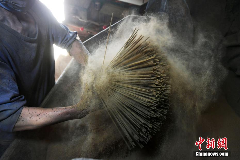“一炷蒲香滿庭烟,香香韵味入丹田”,福建永春达埔镇制香已有300多年的历史,被誉为“中国香都”。如今,达埔共有制香企业296家,产品达300多种,年产值突破40亿元,已成为中国最大的制香基地之一。图为抡香——工人用双手手掌将香做圆形的转动,使香料均匀地附着在香支上,并适时地将有瑕疵的香挑出。吕明 摄