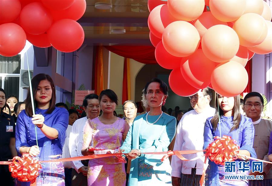 12月23日,在缅甸仰光,缅甸国务资政昂山素季(右四)在移交启用仪式上剪彩。由中国驻缅甸大使馆和中国和平发展基金会出资援助改造的中缅友好医院暨杜庆芝医院移交启用仪式23日在仰光举行。 新华社发(吴昂摄)