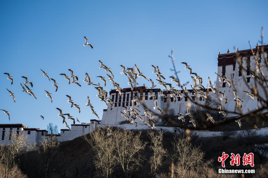 12月27日,一群候鸟飞过位于布达拉宫脚下的宗角禄康公园。寒冬时节,位于西藏拉萨市中心的宗角禄康公园随处可见成群的候鸟,众多候鸟为冬日的拉萨增添了一道亮丽的风景。 中新社记者 何蓬磊 摄