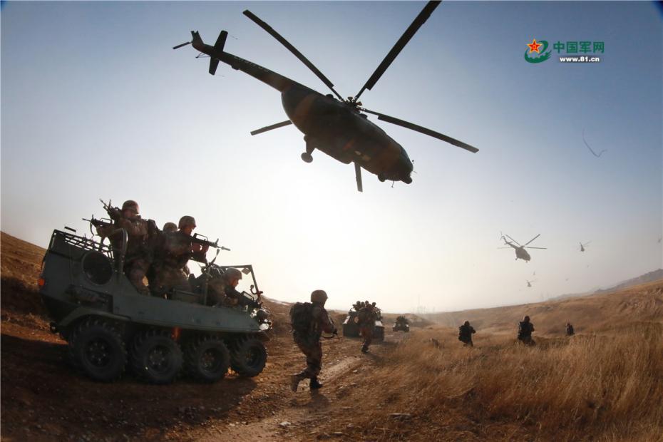 12月中旬,第83集团军空中突击旅官兵在太行山腹地搭乘直升机向“敌”纵深实施机降、索降,并利用空投的“山猫”全地形突击车等轻型装备迅速夺“敌”要点,发起突袭。冯雨 摄影报道 图片来源:中国军网
