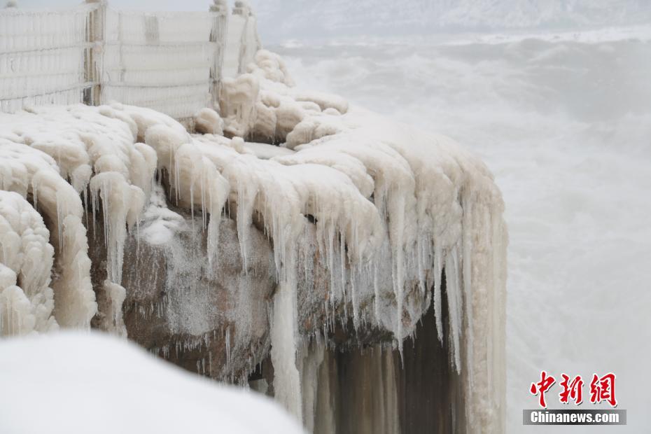 陕西多地迎来2018年的首场降雪。延安黄河壶口瀑布一片银装素裹,瀑布两岸被积雪覆盖,岩石和护栏上出现大小不一、形态各异的冰挂,积雪和冰挂让冬日里的壶口瀑布更显辽阔与壮观。梁鹏 摄