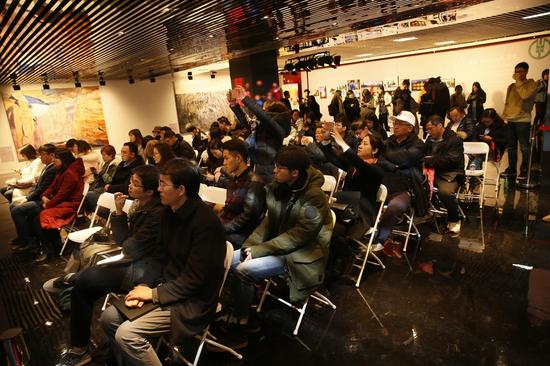 本次作品展策展人,新浪网图片总监翟红刚发表讲话。一起参加交流的还有导师陶慧秧(左二)、王远凌(左四)、第五季学员陈瑶(左三),第四季学员朱骏(左五)。