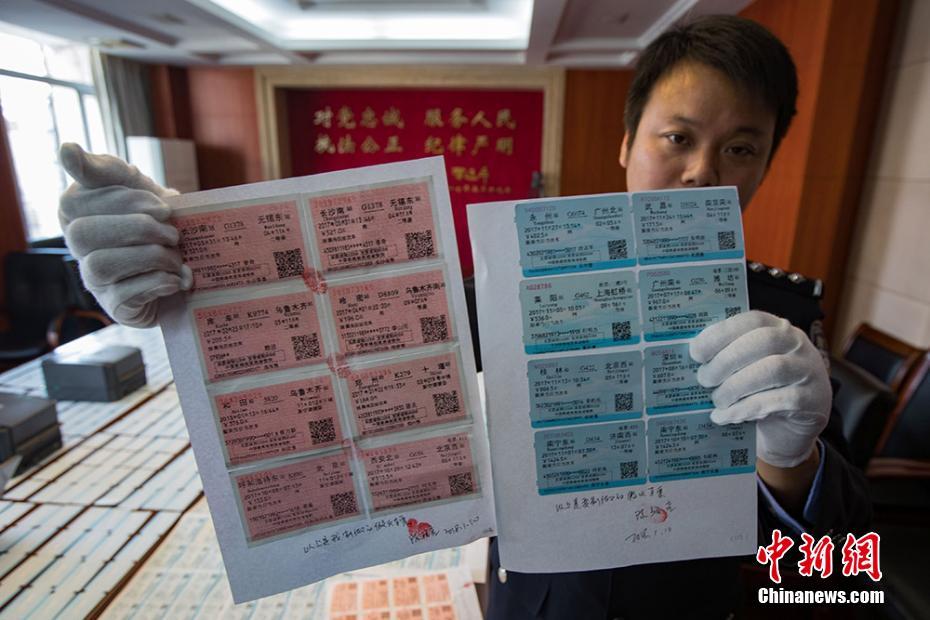 1月11日,南京铁路公安处民警展示缴获的假火车票。10日下午,南京铁路公安处破获一起制售春运假票案件,据办案民警介绍,南京铁路公安处日前开展“2018猎鹰打票贩”专项行动,刑警支队联合特警支队民警通过缜密侦查、分析判断,捣毁了隐藏在安徽省颖上县某小区的一处制售假火车票的窝点,抓获犯罪嫌疑人陈某某,当场缴获假火车票182张,火车票半成品2033张,制假电脑1台,打印机3台,票案价值近10万余元。目前,犯罪嫌疑人已被南京铁路公安处刑事拘留,案件正在进一步审理中。泱波 摄