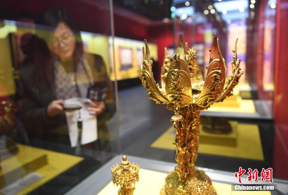 1月12日,117件唐代以来的藏族文物在浙江杭州西湖畔展出,蜚声海内外的唐卡、妙相庄严的造像、工艺精良的法器等各类文物珍品展示了雪域文明的深厚底蕴、历史成就与艺术魅力。中新社记者 王刚 摄