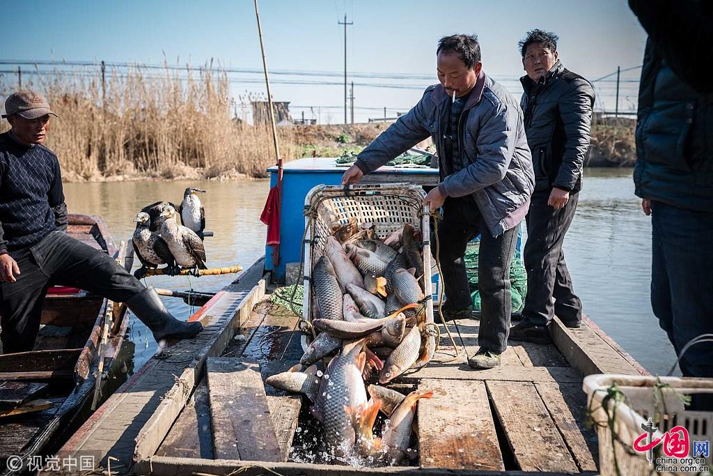 2018年1月9日,江苏兴化,今年32岁的王海,和爷爷、爸妈等一家9口,陆续登上船,开始了一天的捕鱼生活。刚踏入社会时,王海的第一份工作是装修,每天工作12个小时,每个月也有几千块钱的收入。几年前,网络销售风潮刮到了家里的小村子,看着周围邻居在网上赚了钱,王海也心动了。2016年,王海辞去工作,启动了网店,围绕180只鸬鹚,开始了他技艺传承的网络创业之路。图片作者:牛镜/视觉中国