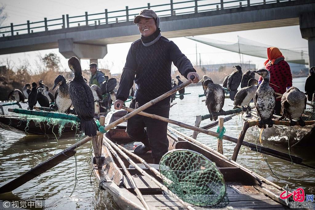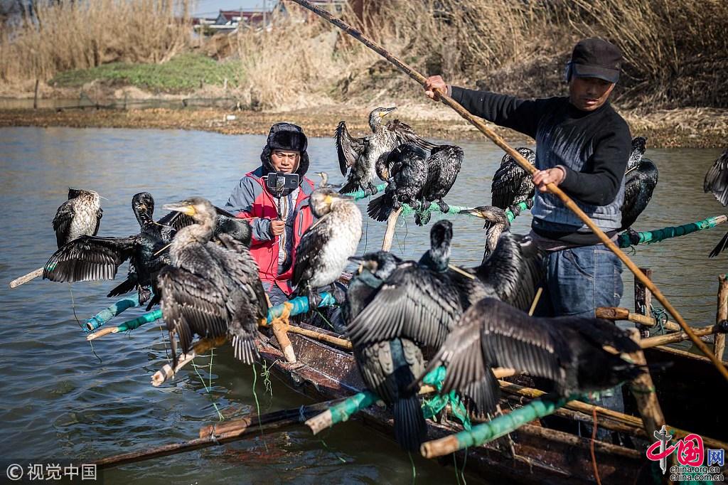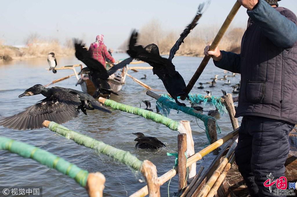 王海家承包了30公里的河道,养了180只鸬鹚捕鱼。鸬鹚捕鱼,对王海来说是一门祖传八代的技艺。但是,随着现代捕鱼技术的发展,鸬鹚捕鱼这门苦差事被越来越多的渔民抛弃,已经濒临失传。“因为使用鸬鹚捕鱼会特别辛苦,尤其是冬天,零下5度的低温里,还得下河,几乎每个人手上都有冻疮老茧,现在袁家庄也只有我们一家会用鸬鹚捕鱼了。”王海说。图片作者:牛镜/视觉中国