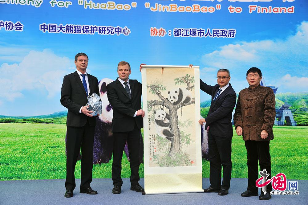 都江堰市人民政府副市长董健向芬兰艾赫泰里市市长加墨?佩里迈基赠送一副熊猫画卷。