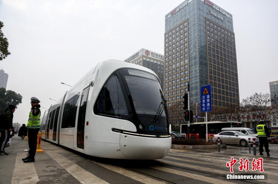 1月18日,“光谷量子号”有轨电车在武汉光谷关山大道上行驶。当日,武汉光谷有轨电车T1、T2示范线开展市民免费试乘活动。光谷有轨电车采用的是能量型超级电容无网供电技术。车身全长34.8米,每列车5节编组,最高运行时速70公里,最多可容纳360人。武汉光谷有轨电车T1、T2线于去年12月18日实现全线通车试运行,T1线连接关山大道和光谷步行街等繁华地带;T2线从光谷西一路往东,覆盖518平方公里的东扩区域。 中新社记者 张畅 摄