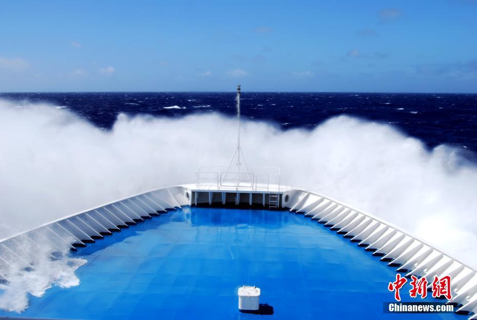 元旦出航,在赤道附近预定海域圆满完成第26、27颗北斗导航卫星海上测控任务的中国远洋航天测量船“远望6号”,历时20天、远洋航行2000余海里,于1月20日凯旋归来,顺利返航至长江边港口停泊。图为经受风浪考验,远望6号劈波斩浪。 魏龙 高超 摄