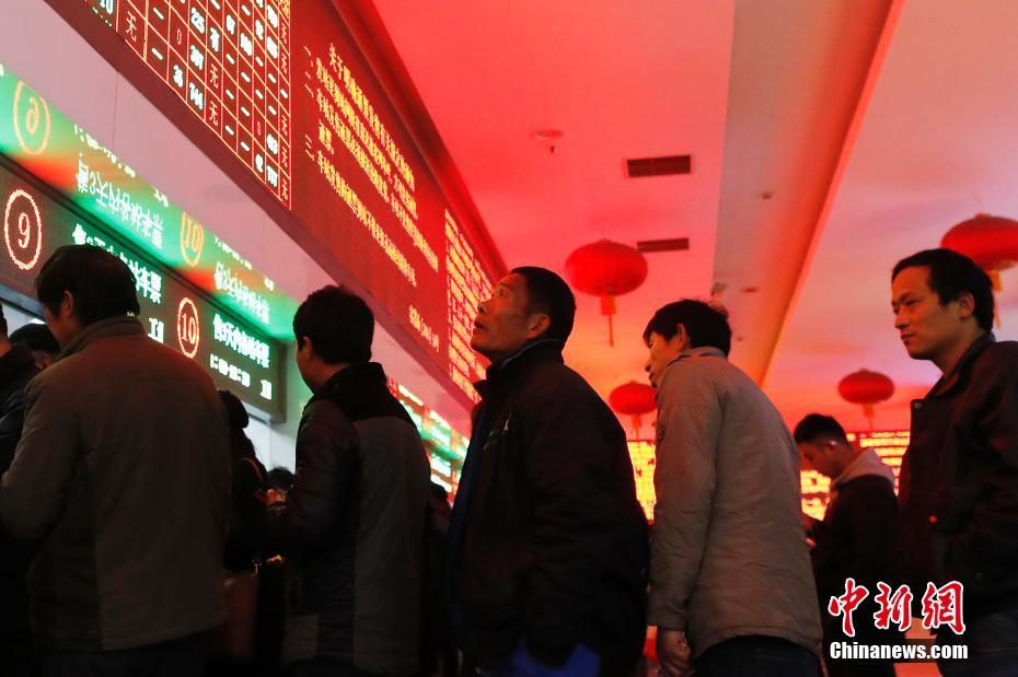 由于今年春节时间较晚,相对于节前分散的客流,今年节后的春运,务工流、学生流、探亲流等返程客流将重叠,返程抢票压力或大于节前。图为旅客在铁路上海站售票大厅内排队购买车票。 殷立勤 摄
