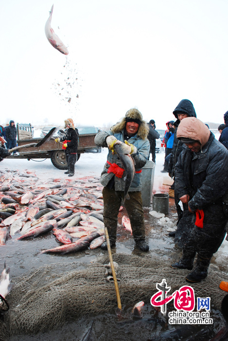 在三岔河渔场的冰面上冬捕的人们。冯雪清 摄影