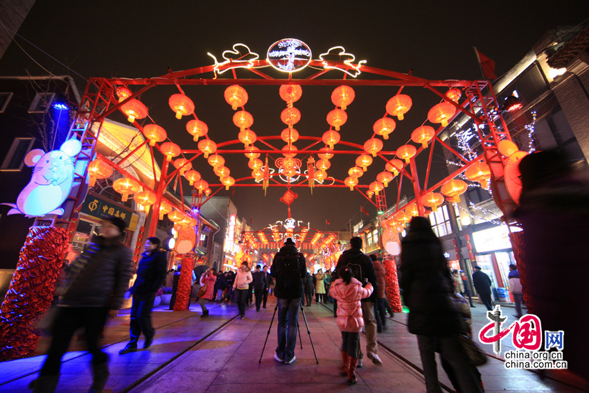中国网讯 农历正月十五是中国的传统节日元宵节。想要体味充满着老北京气息的传统佳节,当然还是要来前门大街。这里游人如织,灯火相映,古典风格的建筑与大红灯笼组合在一起,营造出原汁原味的“中国年”。边赏花灯边看兔爷,边吃小吃边观杂耍,不亦乐乎。