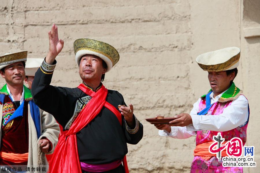 第二天天亮前,新娘经过梳妆打扮,头上罩上一层层五颜六色的漂亮纱巾,上马起程。新娘的亲属将一把红筷子撒在院子里,母亲将新娘穿过的衣服扔出墙外,表示姑娘已经出嫁。 中国网图片库 佳奇/摄影