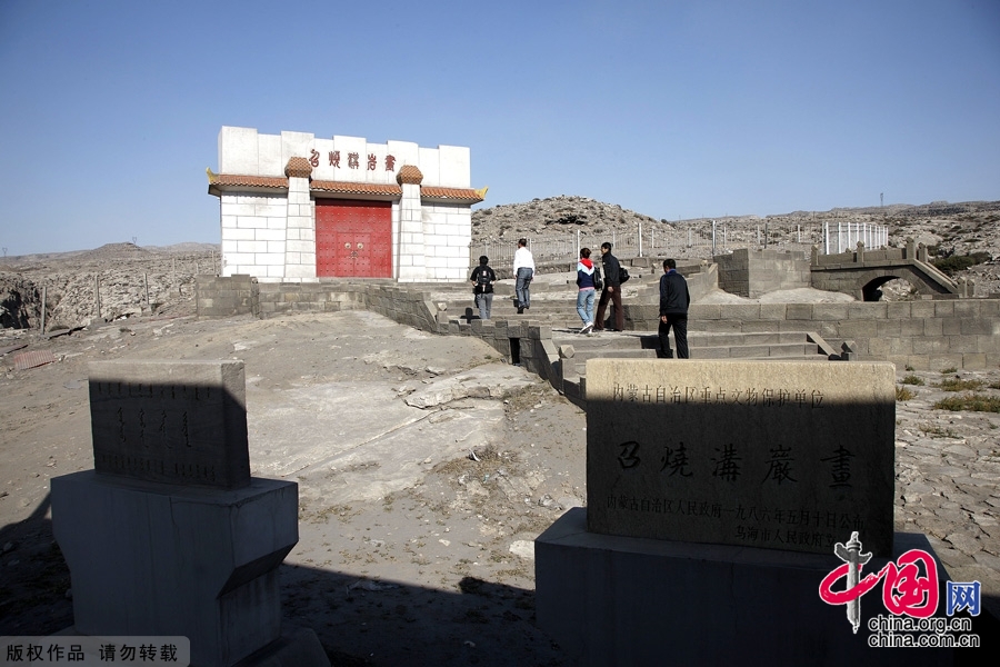 召烧沟岩画,位于乌海市市区东南15公里桌子山脚下召烧沟西口南坡,属贺兰山北部的余脉,是一处新石器时代北方游牧民族的文化遗迹。岩画磨刻在约650平方米的石灰岩磐石上,内容丰富,风格古朴,以人面像和动物图像为多。在可分辨的200余幅画面中,有百分之九十的内容是以面具为载体的太阳神图像和人面像,其形象千姿百态。这些各异的人面像多为神灵的图腾和和象征,宗教色彩十分浓厚。这些精美的艺术珍品,为研究早期游牧文化,探索人类文明进程提供了重要的史料依据,尤为重要的是这里就是著名的“太阳神”岩画现场。召烧沟岩画乃中国岩画的精绝之作。1986年5月,内蒙古自治区人民政府将召烧沟岩画公布为自治区级重点文物保护单位。(成卫东 魏严 图/文)