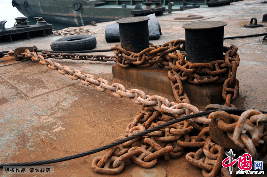 图为在云阳港务站码头拍摄用于固定趸船的锚索,因水位平稳、水流减缓,使用频率不足过去的10%,锚索上沾满了锈迹和泥斑。中国网图片库 饶国君摄影
