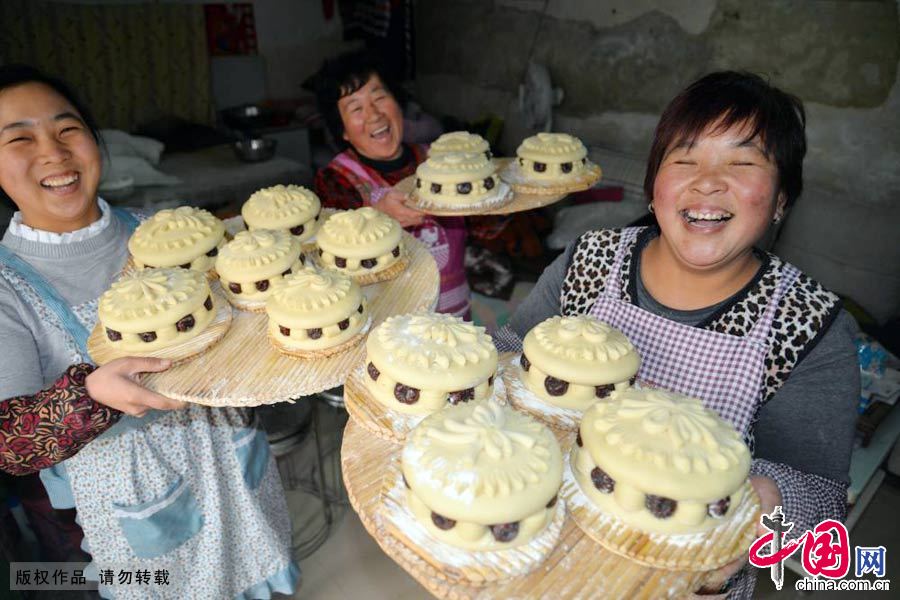 2月11日,山东省聊城市茌平县贾寨镇前寨村村民贾红梅(右)和家人展示展示制作好的花糕。