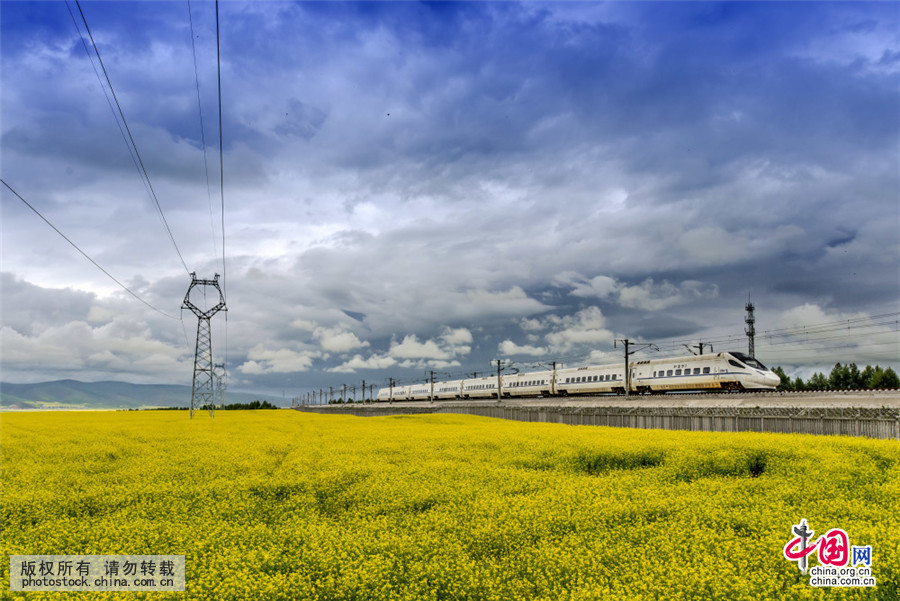 穿梭于油菜花海的动车,犹如一条蛟龙在花海中舞动。中国网图片库 刘国兴/摄
