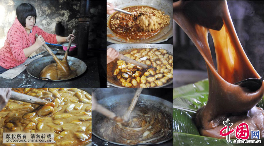 甜粿是海南人过年祭祀祖先和食用的必备佳品。春节前几天,家家户户都在为制作甜粿忙得不可开交。先是将糯米浸泡后在石磨上磨成糊并挤干水份,再将红糖煮成胶质,然后将捏成团的糯米放进锅里边煮边搅拌,一个多小时后取出就成为香甜可口的甜粿。这是简单的制作方法,有的人家采用隔水蒸煮法制作甜粿,则整夜要有人守在灶台前添柴加水,非常辛苦。虽然如此,古往今来,制作甜粿仍是人们必不可少的过年差事。过去由于交通不便,许多不能返乡过年的华侨常托人捎一筐甜粿到国外食用,思乡之情溢于言表。中国网图片库 蒙钟德摄影