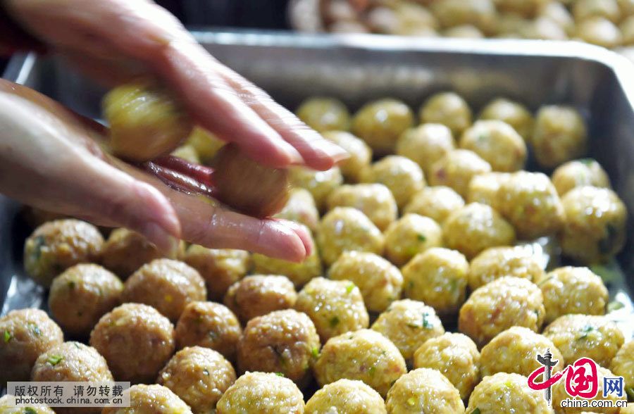 1月29日,在合肥市瑶海区和平路街道社区大食堂,工作人员和社区志愿者在为居民赶制各类春节美食“圆子”,“圆子”是安徽地区居民春节期间必备的一道美味佳肴,工艺讲究,制作过程繁琐,以猪肉和糯米为主料,辅以香菇,荸荠,葱姜,茶干丁,粘取水淀粉,搓成圆形,入锅炸制即可,色泽金黄,外酥里嫩,便于保存。另外还有挂面圆子,山芋圆子,猪肉圆子等地方传统春节美食,都是安徽一带春节必备的菜肴,寓意团团圆圆,美满幸福。