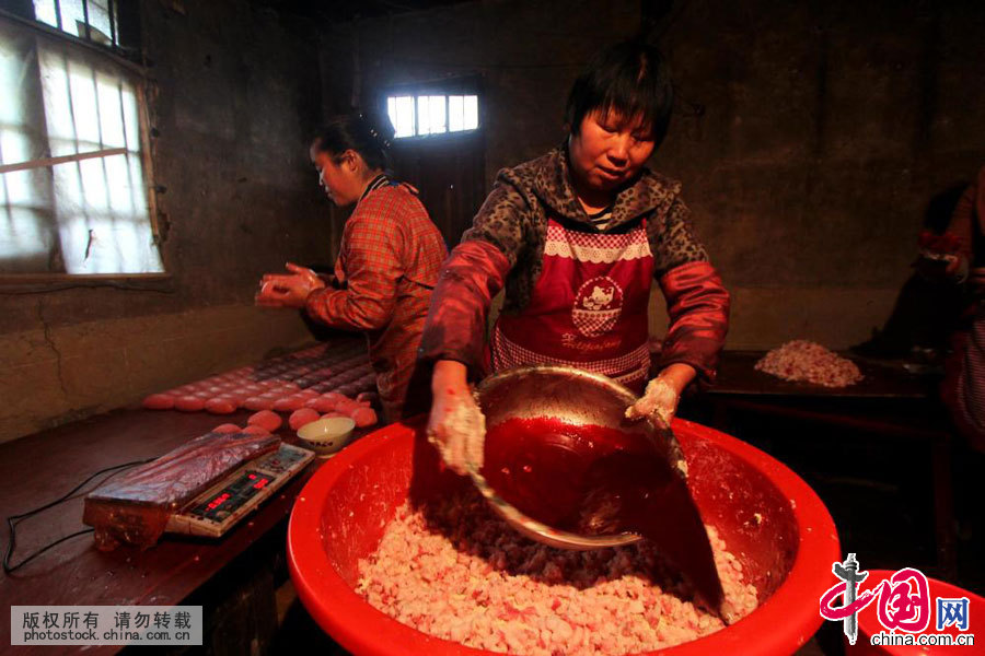2015年12月23日,湖南省隆回县小沙江镇,一位农家妇女正把五花猪肉和豆腐混合后洒入猪血。