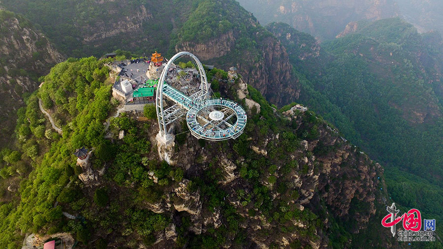 4月30日,北京石林峡景区,无人机航拍的目前为止“世界之最”飞碟玻璃观景台。夕阳下的玻璃观景台令人震撼。(图文/达明)