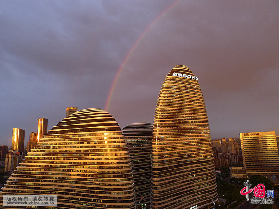 2016年5月23日,北京朝阳区望京SOHO傍晚现双彩虹和彩云景观。 中国网图片库 张健 摄