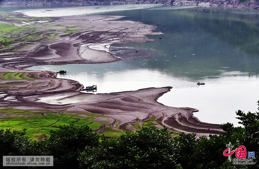 2016年6月14日,在重庆市云阳县高阳镇团堡村、洞溪坝一带拍摄的“水元阳”奇观。随着三峡工程腾库防洪退至145米汛限水位,位于库区腹地的高阳镇大量滩涂显现,昔日的良田沃土露出水面,形成独特的“水元阳地貌”。