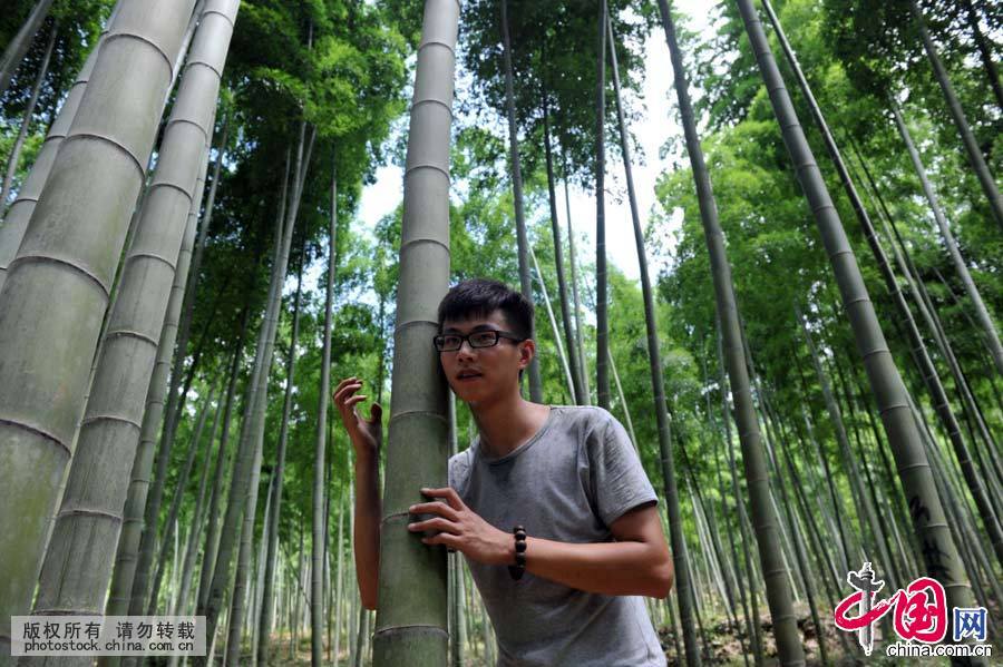 2016年7月17日,在浙江省临安市白水涧村“鲜竹酒”种植基地内,工作人员在敲击竹子,凭竹子发出的声音,辨别哪节竹子有酒。中国网图片库